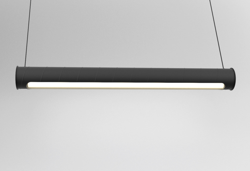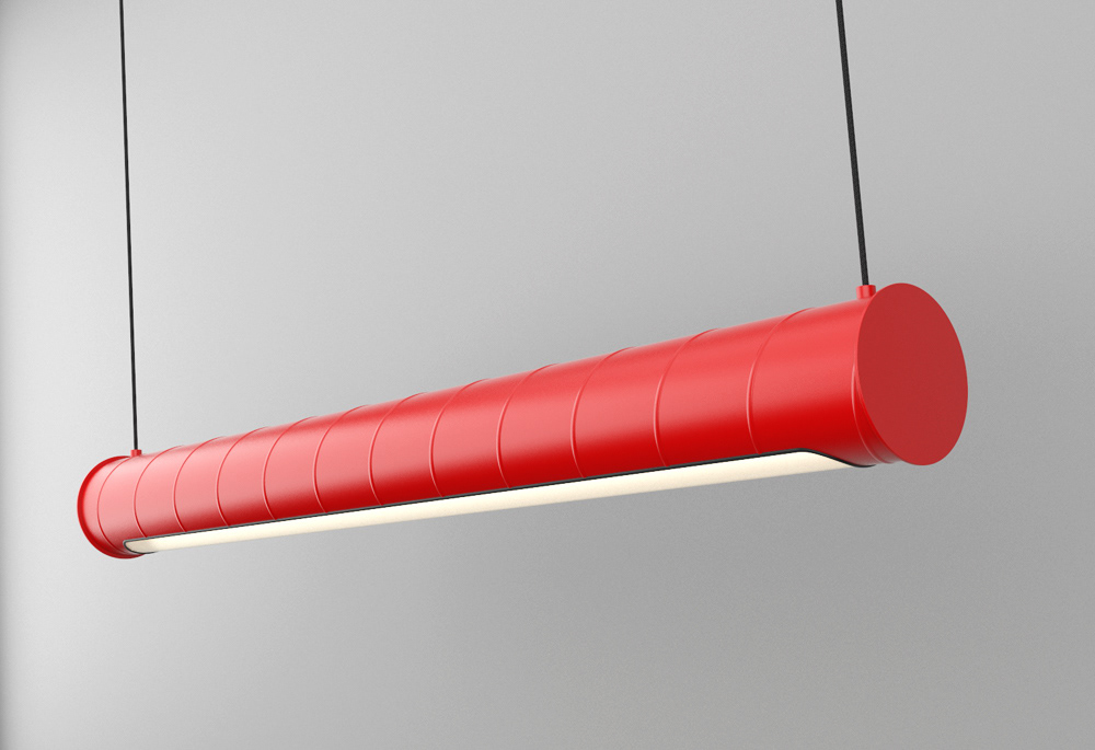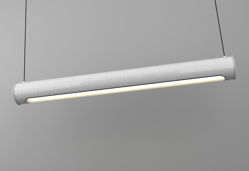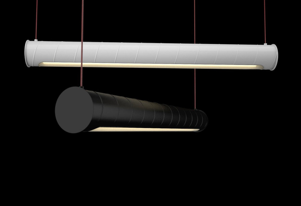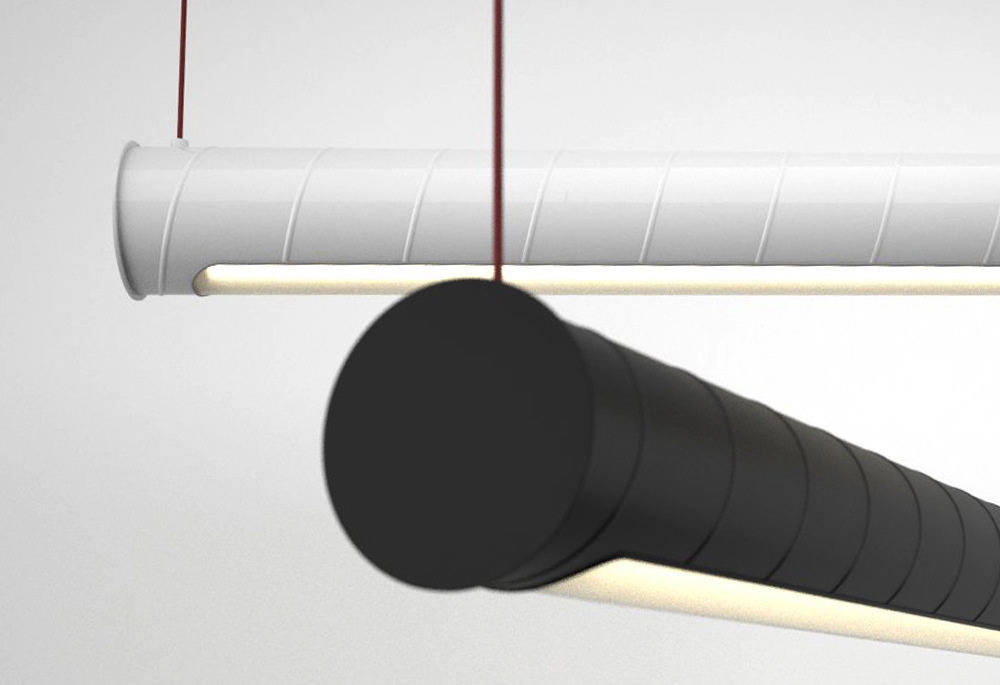 A hanging light system inspired by the visible duct work commonly seen in open ceiling interiors.